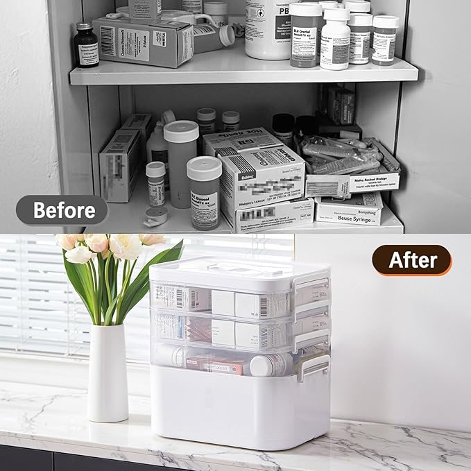- Adjustable Medicine box: The number of layers can be flexibly switched to meet your diverse needs. First aid medicine can be placed on the 1st layer, daily medicine on the 2rd layer, spare medicine on the 3rd layer and the white bottom layer protects your privacy and doesn't make the stored items look cluttered.