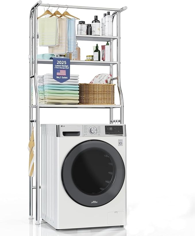 Over The Washer and Dryer Storage Shelf, 3 Tier Laundry Room Metal Drying Rack with Towels Hangers, Space Saver Organizer for Hanging Clothes and Towels (Stainless Steel RA1)